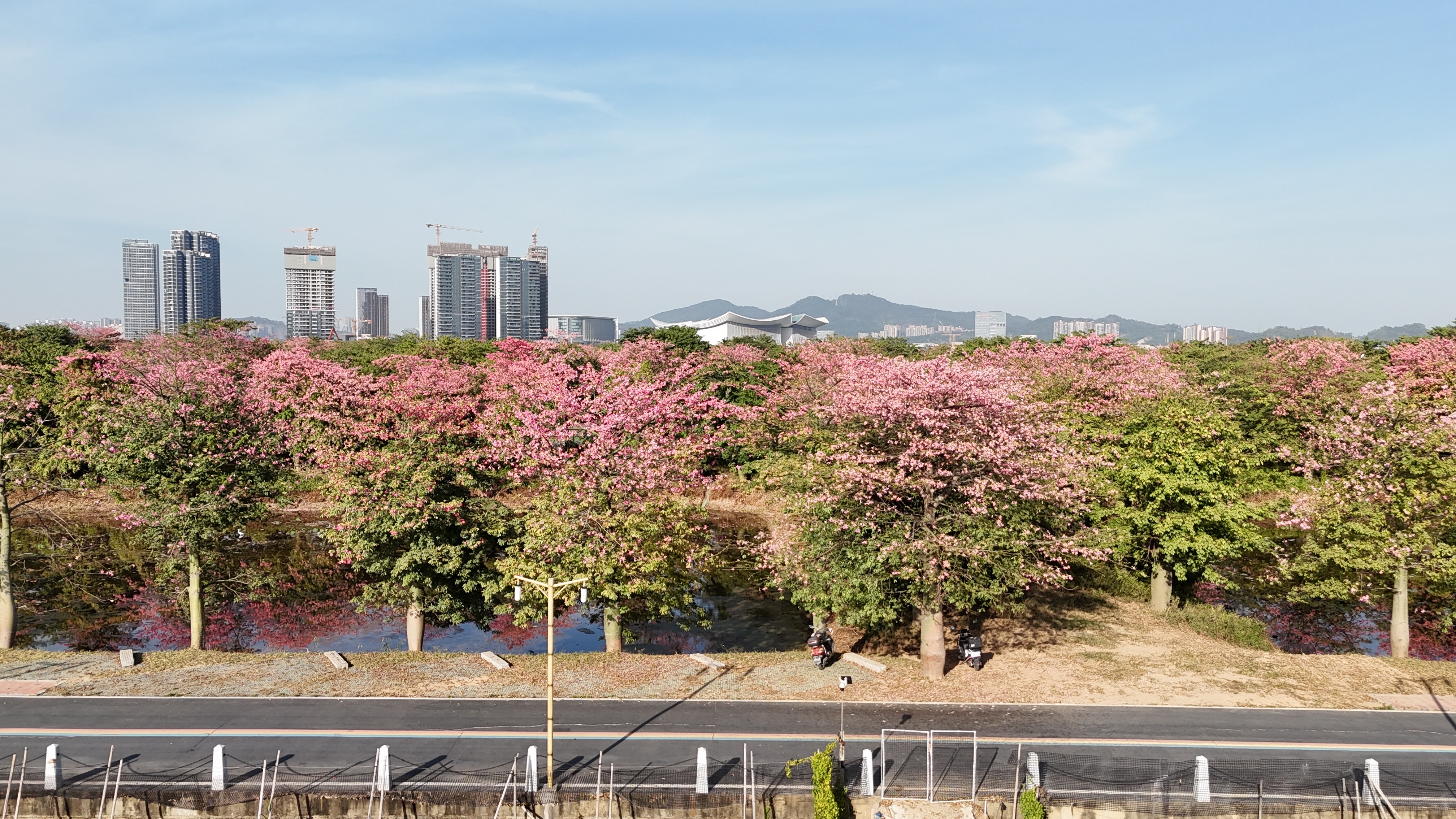 其中最引人注目的,当数5800株美丽异木棉构成的粉色长廊。这些异木棉胸径普遍达35—80厘米,枝干挺拔,树冠如伞。每年11月至12月,粉色的花朵如约绽放,花期持续一个月之久,成为横沥金融岛和前锋水乡景区配套的一处亮丽景观。