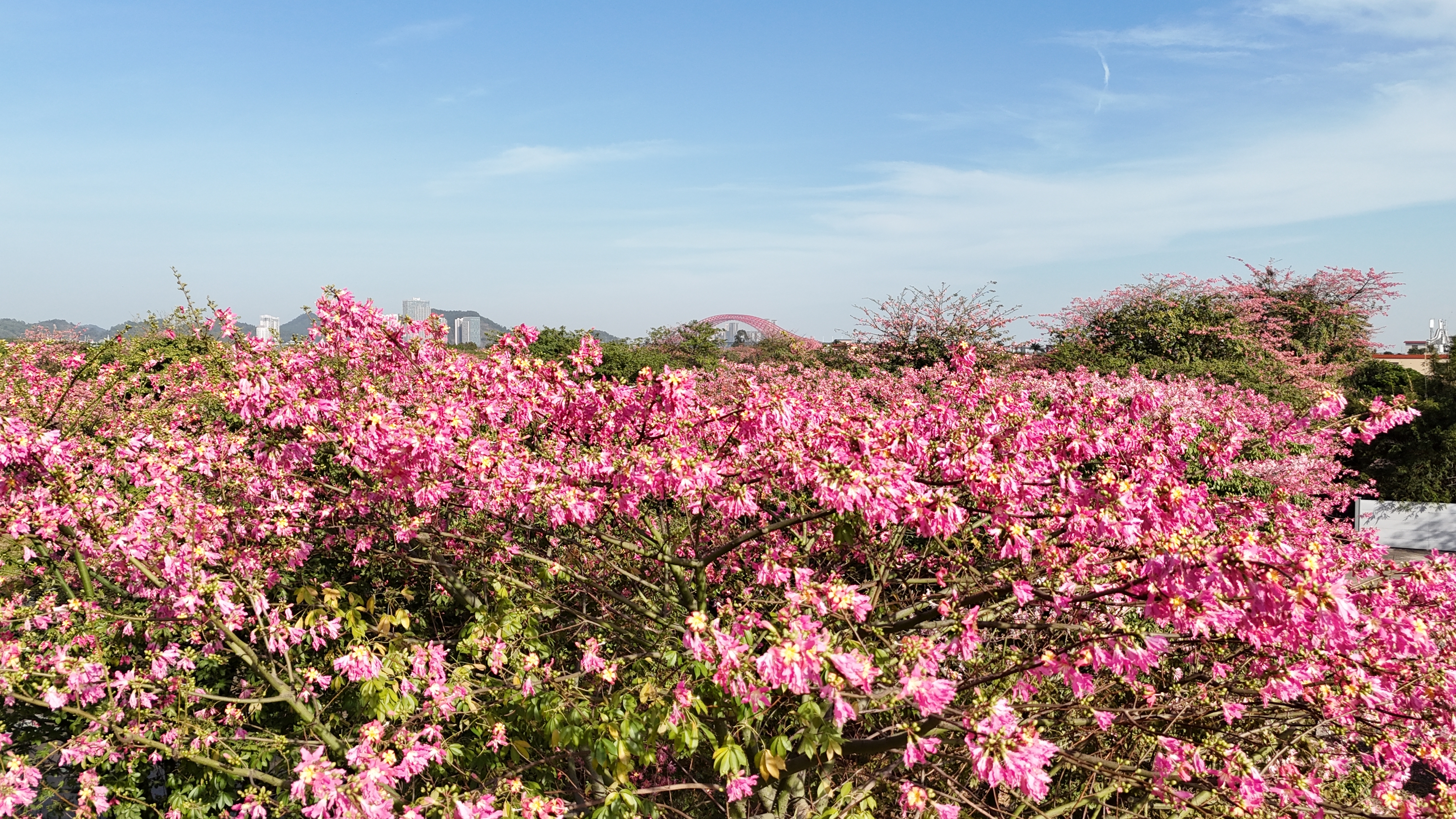 冬日暖阳下,5800株异木棉在珠江畔热烈绽放,粉色的花云与横跨江面的明珠湾大桥相映成趣,为广州南沙披上了一袭浪漫的粉色盛装。